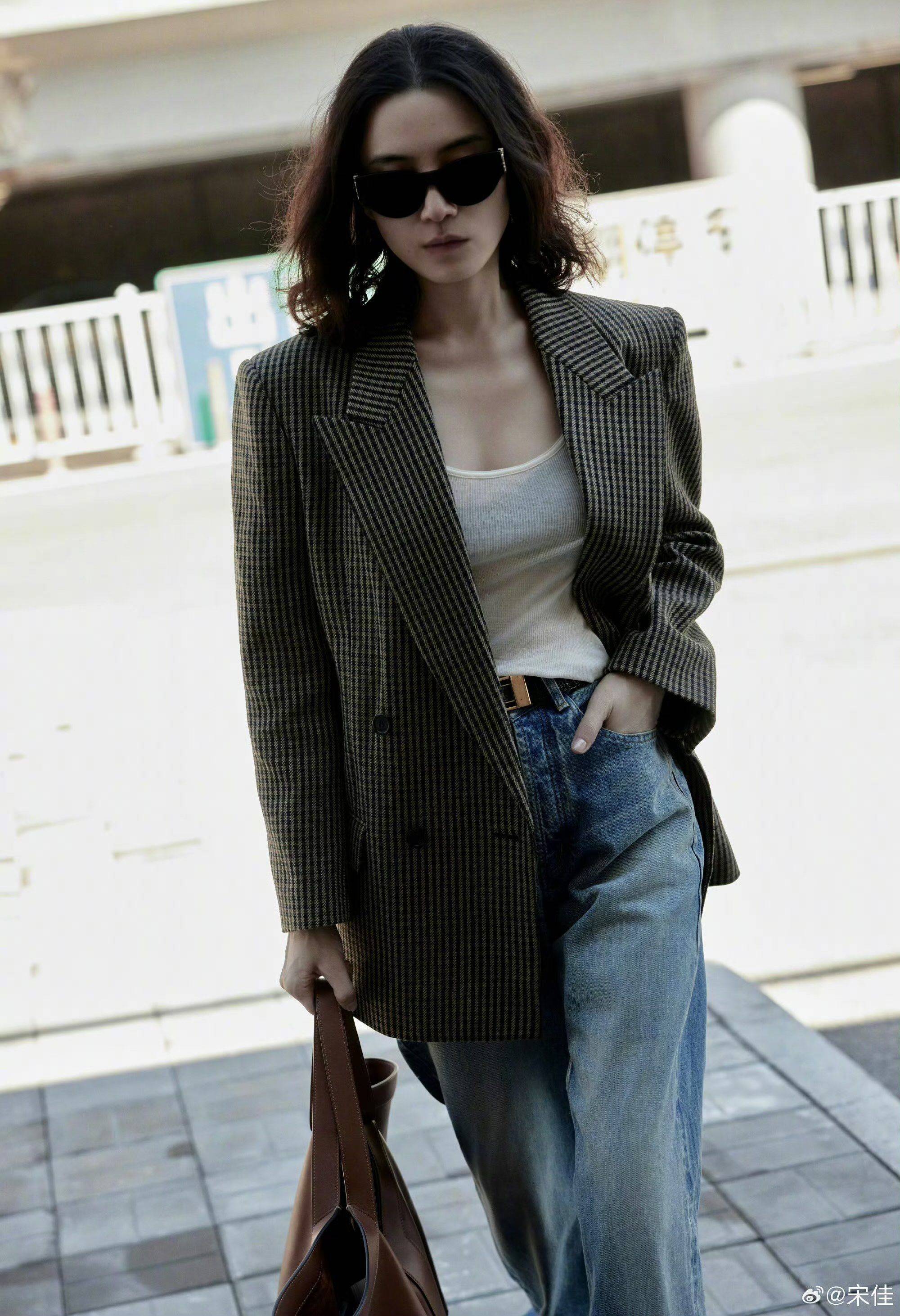 选对版型比瘦十斤更重要。宋佳最爱挺括的“直角肩”西装,像她那件棕色格纹双排扣外套,肩线利落不塌塌,内搭灰色V领针织衫,软面料中和硬挺感,领口若隐若现的锁骨线条超显瘦。普通人别选oversize到压身高的款,肩宽比自己肩线cm刚好,既能藏住拜拜肉,又不会像偷穿老公衣服。她还特别会用腰带掐出腰线,哪怕是宽松的牛仔直筒裤,勒上腰带瞬间腿长一米八——这招对苹果型身材尤其友好,亲测比塞衣角更自然。 颜色搭配藏着减龄密码。2025年流行的棕色系被她玩出花:焦糖棕西装配蓝色阔腿牛仔裤,复古又清爽;同色系棕色风衣搭半身裙,温柔得像刚出炉的拿铁。怕老气就学她“上深下浅”,比如黑色西装内搭白T恤,下装配浅蓝破洞牛仔裤,脚踩小白鞋,休闲感冲淡正式感。悄悄说,她私下超爱白衬衫+黑西裤的组合,把衬衫下摆随意塞进裤子,解开两颗扣子露出锁骨,通勤约会两不误,40+穿也毫无违和感。